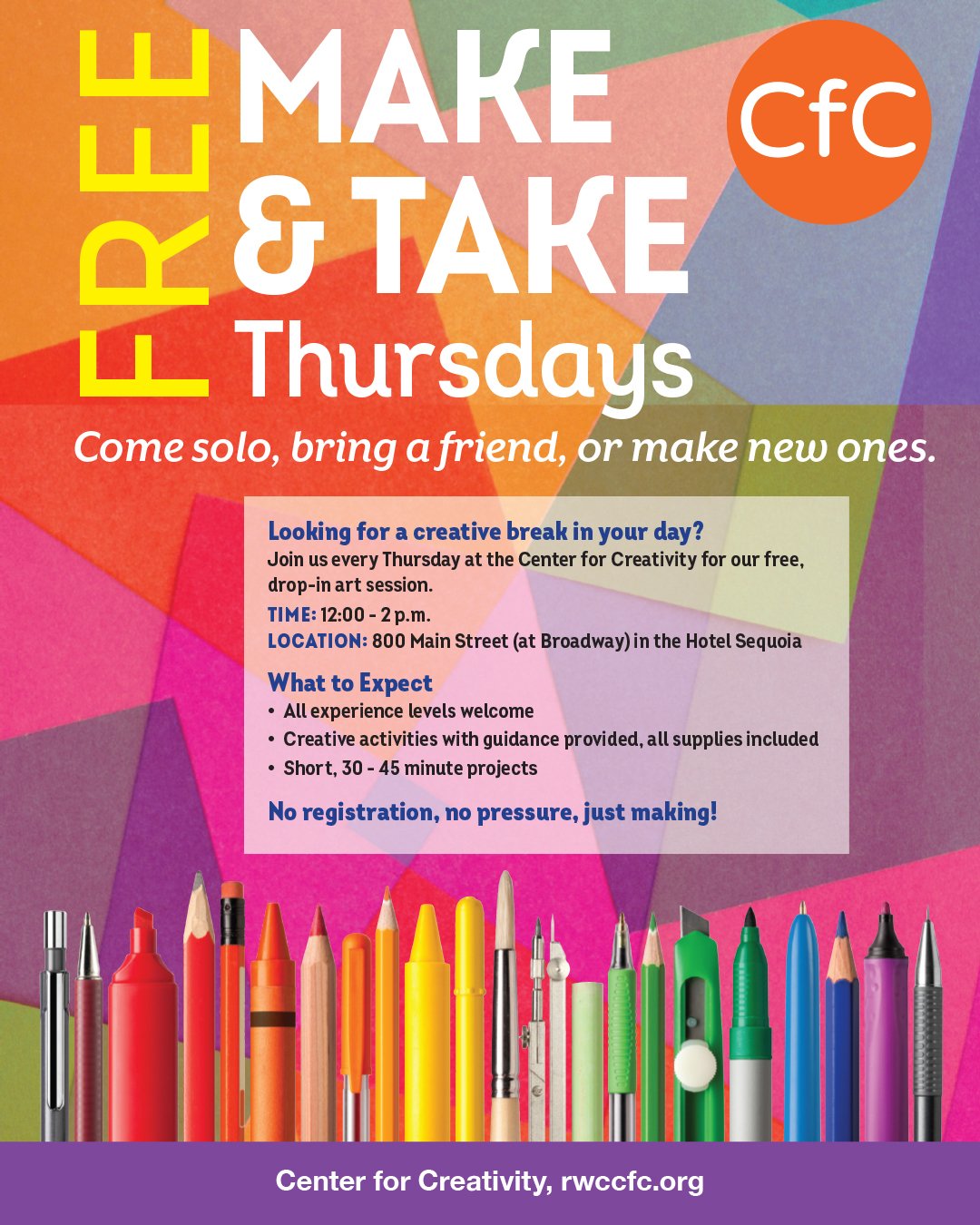 Looking for a creative break in your day? Join us every Thursday at the Center for Creativity in downtown Redwood City for free, drop-in art sessions.